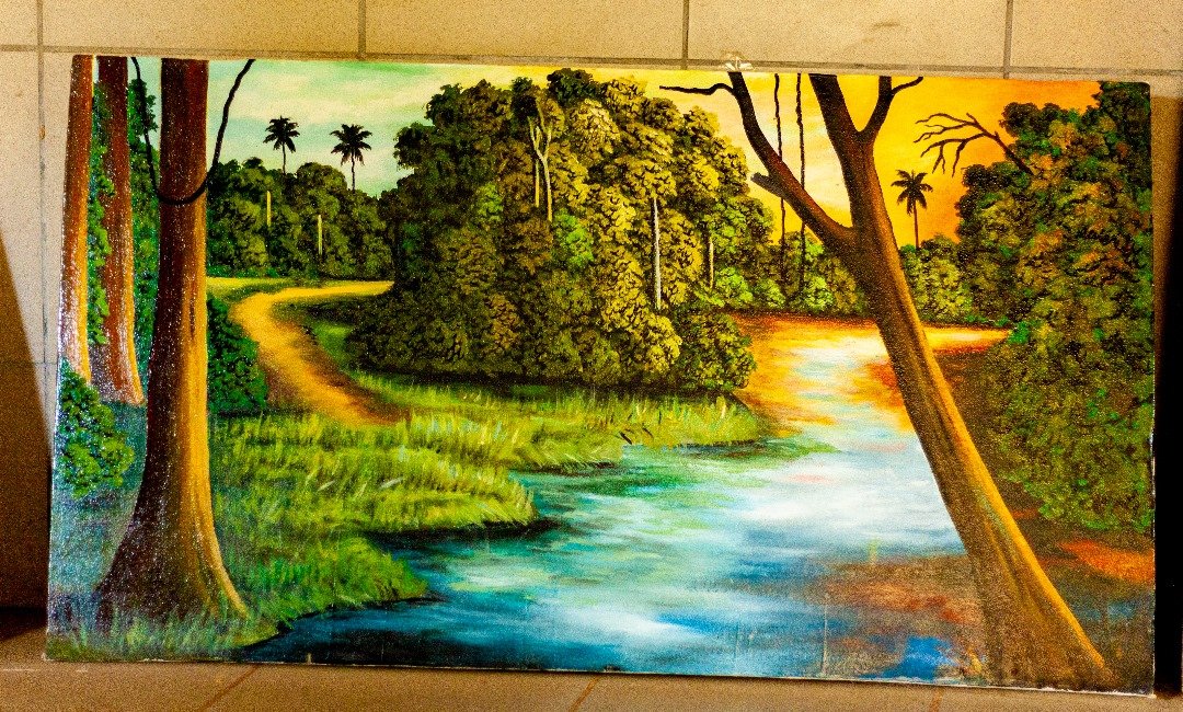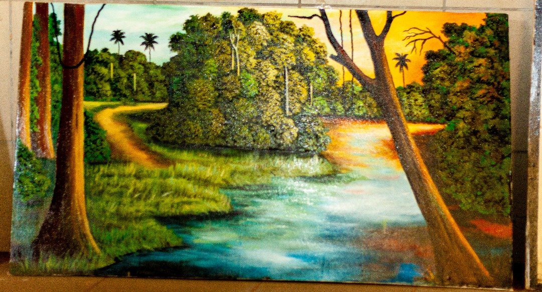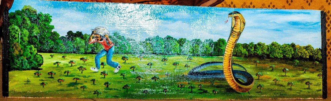 Tableaux à base de peinture reflétant un voleur en train d’être chassé par un serpent au champ, une fille jolie peint et un fleuve dans la forêt.